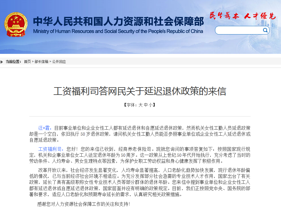 9月3日,人力資源與社會(huì)保障部官網(wǎng)“部長(zhǎng)信箱”欄目發(fā)布了一則“工資福利司答網(wǎng)民關(guān)于延遲退休政策的來(lái)信”。