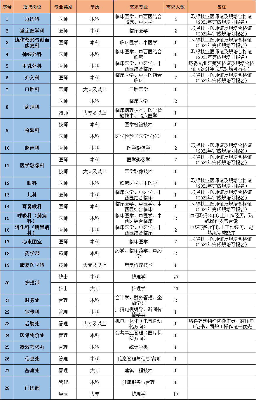 泰州市中醫(yī)院是泰州市衛(wèi)生健康委員會(huì)下屬差額撥款事業(yè)單位,計(jì)劃招聘133名合同制工作人員,具體崗位、專業(yè)、學(xué)歷等要求詳見(jiàn)《泰州市中醫(yī)院2021年合同制工作人員招聘崗位表》(見(jiàn)下表)。